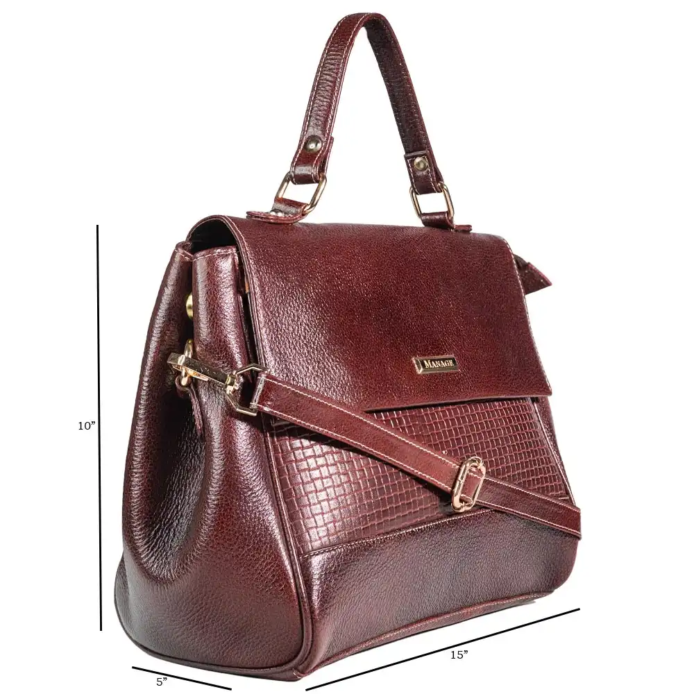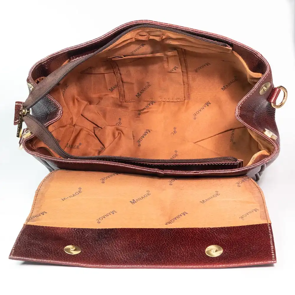 This leather bag has one main compartment,one inner utility pocket,one mobile pocket,one back zip pocket,one short handle and 60 inch long shoulder strap.